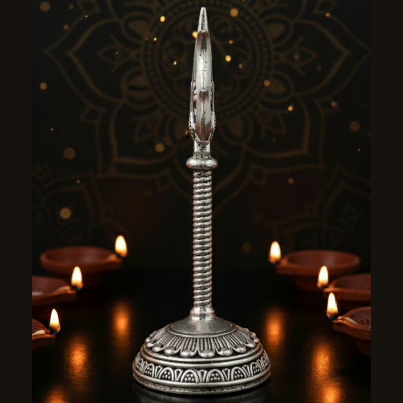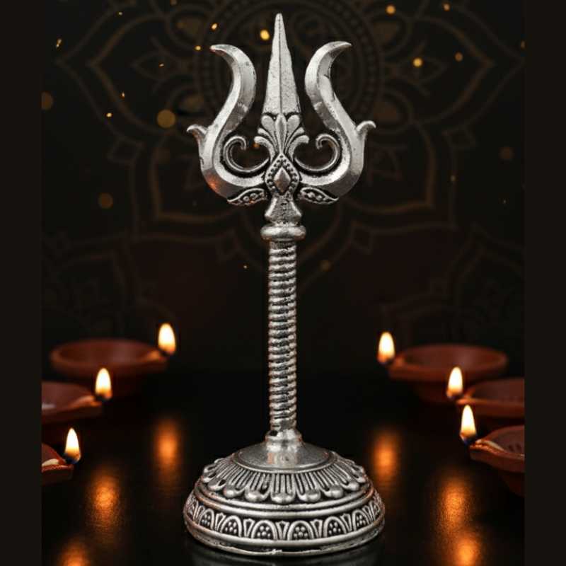Made from premium-quality brass and finished with a pure silver plating, this Trishul Idol embodies power, purity, and spiritual protection. Perfect for daily puja, temple rituals, festivals, or sacred gifting, this handcrafted idol radiates positivity and divine blessings.
